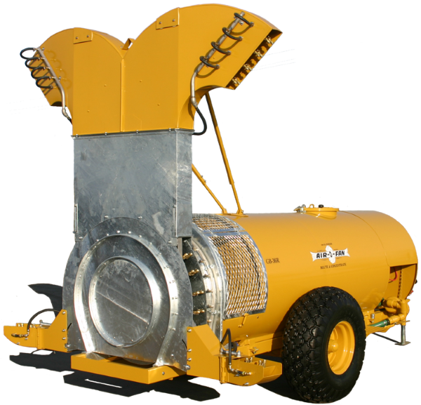 The Air-O-Fan "Reverse Fan" GB-36R "Volute Tower" vineyard sprayers out perform, and out last the competition. Other manufacturers have tried to duplicate our towers without success. The "Reverse Fan" models reduce the amount of leaves and dirt that normally plug the fan guard and housing. Fan life in sandy soil vineyards far exceeds conventional fan housings. Serviceability is made easier with larger guards and inspection covers. The amount of controllable air volume enables the operator to spray effectively throughout the growing season in most applications. Controllable air and direct coverage reduces drift and saves time and chemicals. The GB-36R "Reverse Fan" vineyard sprayers combine performance and simplicity, and can be used in both concentrate and dilute applications. The "Reverse Fan" models come standard with our DK turning hitch and are also available with our 2-point turning hitch option, indented tank option for narrow rows, and our Myers© 2-stage centrifugal pump option.